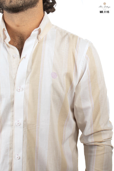 Camisa MR.ORTEGA Rayas Café Claro y Hueso Logotipo Rosa Pastel MR.1115